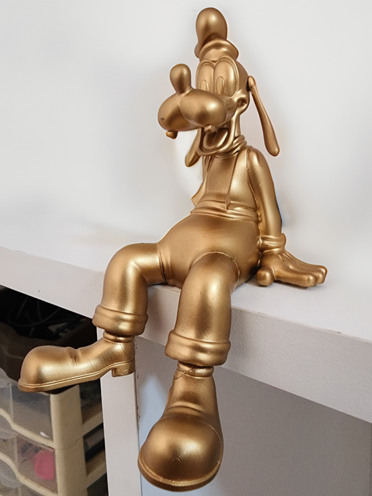 Esta increíble figura de Goofy, impresa en resina 3D de alta calidad, está pintada con un espectacular acabado dorado metálico, ideal para decorar y recordar que los verdaderos amigos son un tesoro.